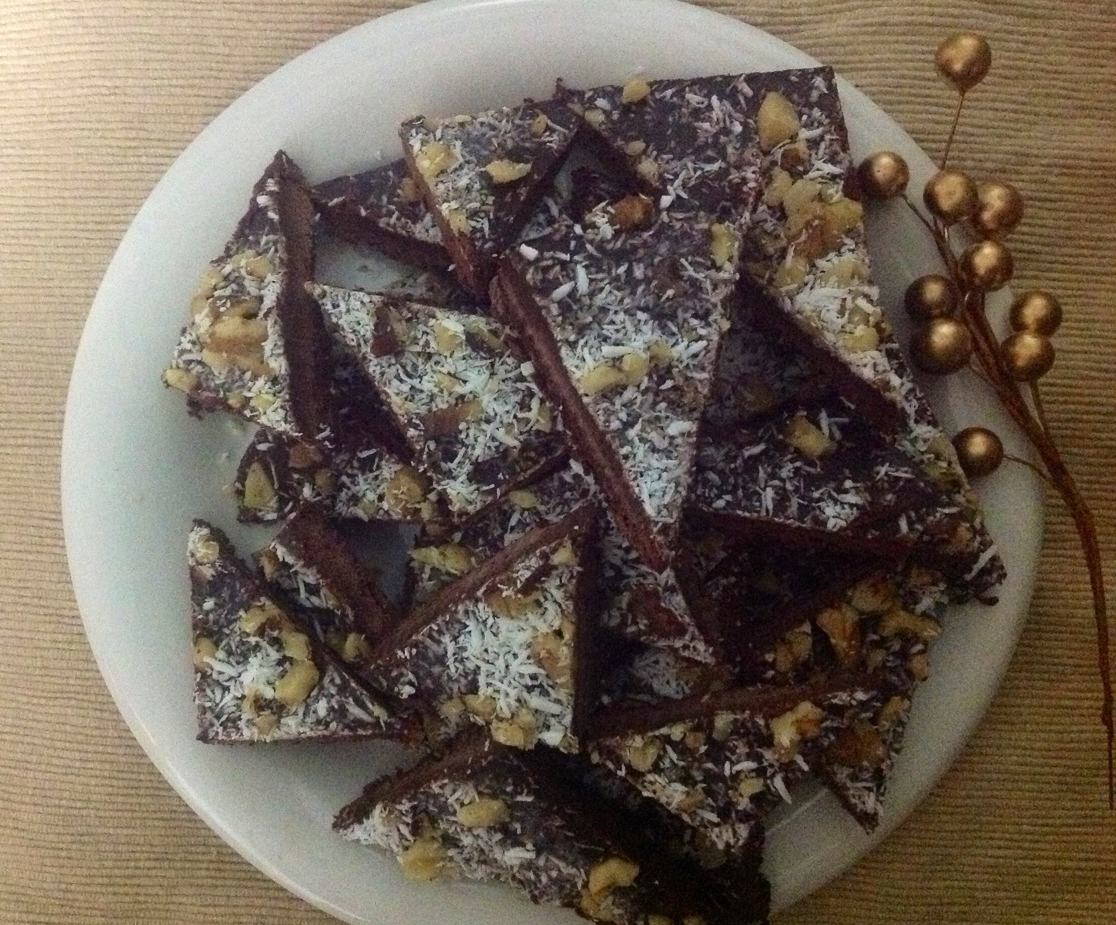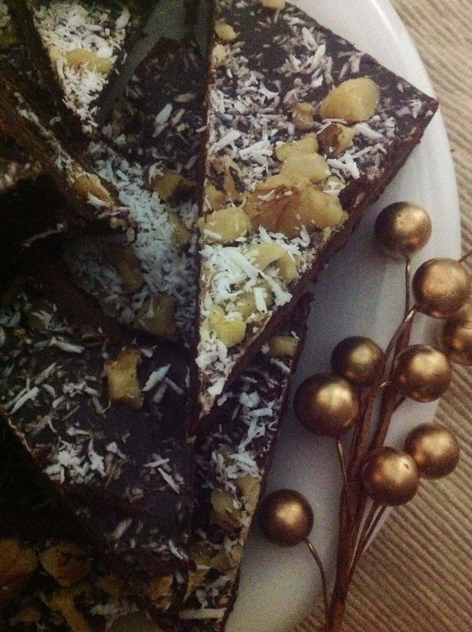 Yet another batch of my homemade raw chocolate. The potential variations are endless. This time I used coconut flakes and walnuts. My contribution to Easter dinner.