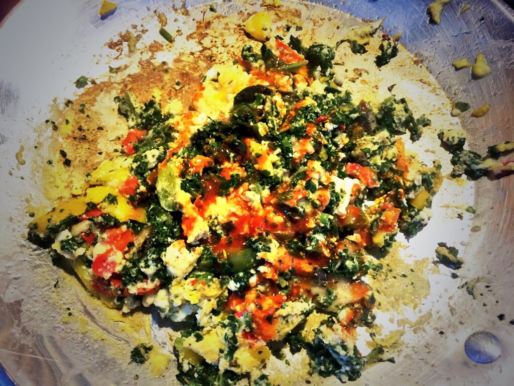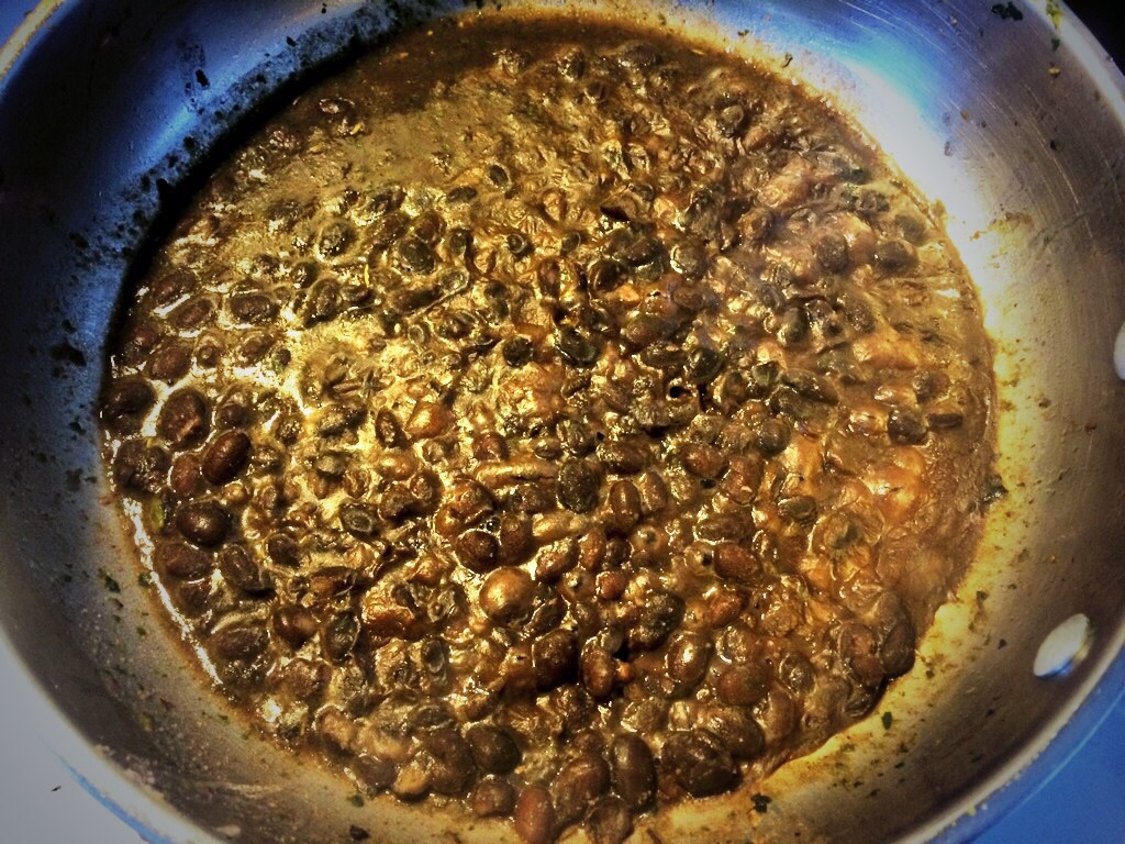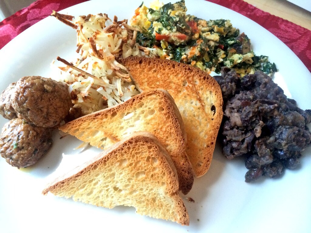 Spinach, mushroom & bell pepper scramble, hashbrowns, beans & cilantro, meatless meatballs in herbes de provence gravy .. with gluten free toast and homemade fruit beer cocktail.