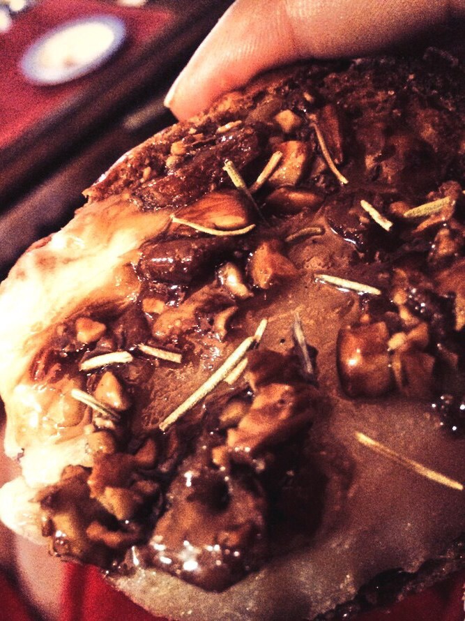 Toasted rolls smothered with cheddar, pear, sweet almond butter sauce & rosemary