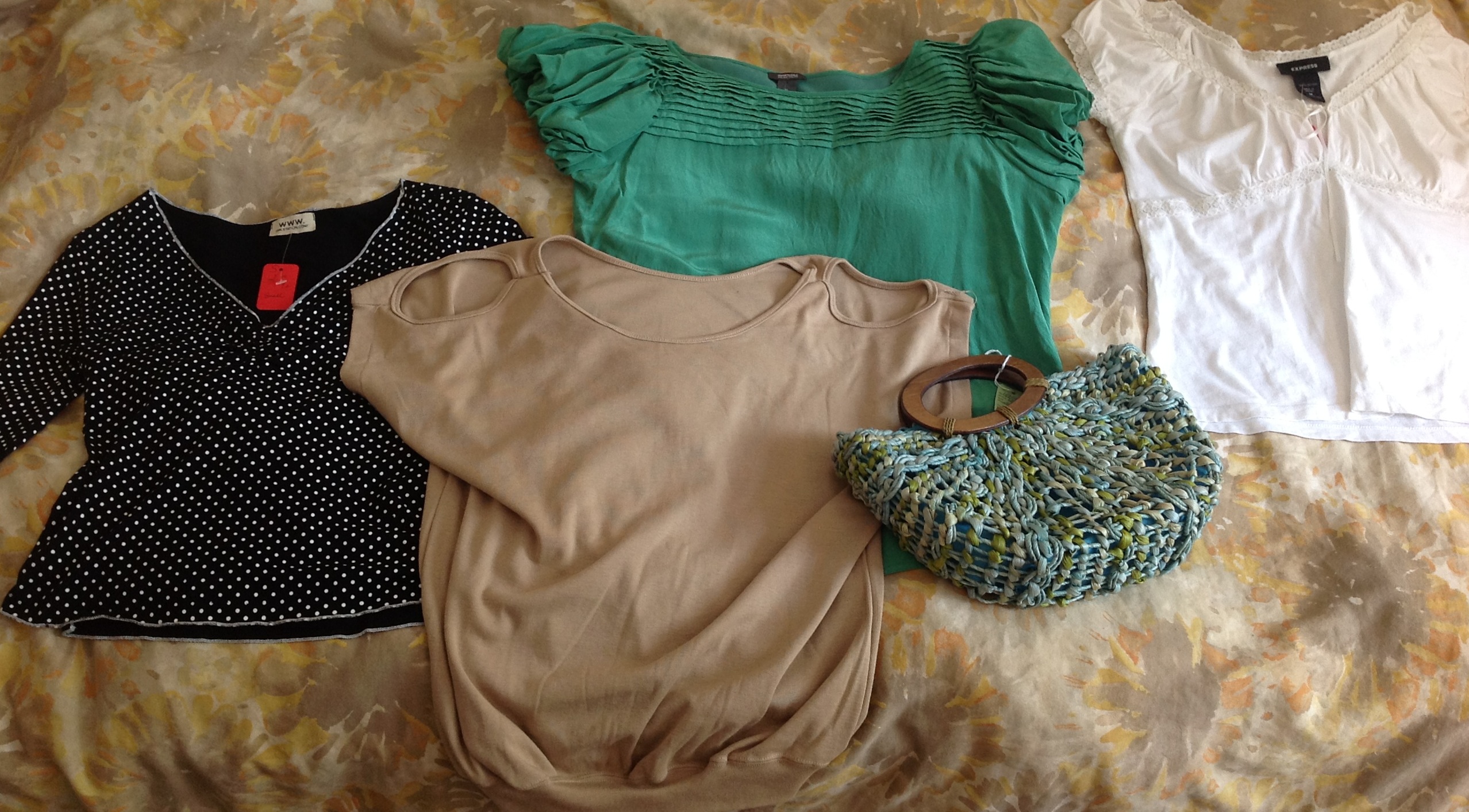 Black pin-dot fitted top: $1, Vintage beige top with shoulder reveal – Crescendo by Michelle E. Golding: $4, Tote Bag – Ahava: $4, Sea green silk blouse with ruffled shoulders – Kenneth Cole: $4, matching dark green stone necklace (not shown): $2, White babydoll top – Express: $3 – Total Haul: $18, Estimated Value: $175