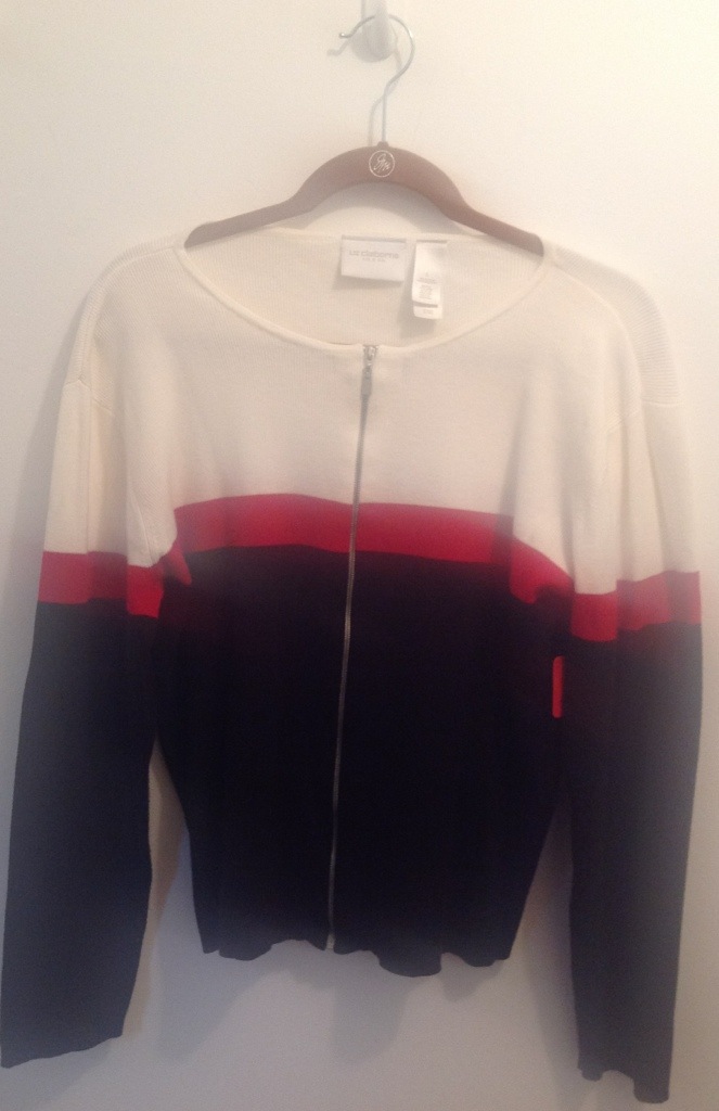 Liz Claiborne zippered cardigan. Lovely with black skinny jeans, heels and my signature fire engine red lipstick. Annnnnd it matches my black/red/beige multicolor gelish manicure!
