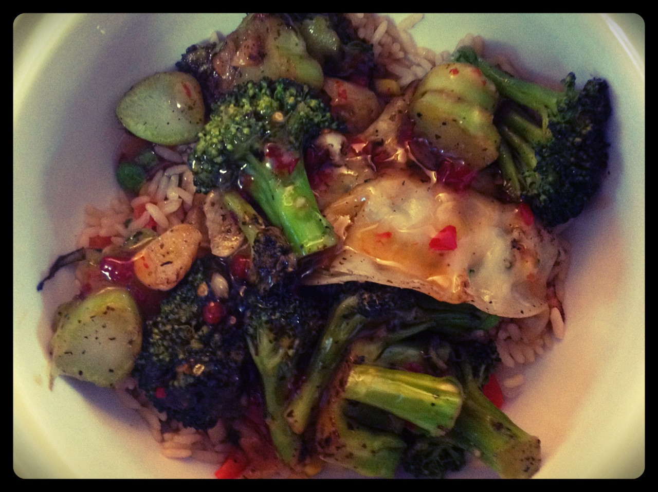 Microwave the rice medley according to the box instructions. Layer it with the sauce, seitan and bok choy. Savor. And thank me later.